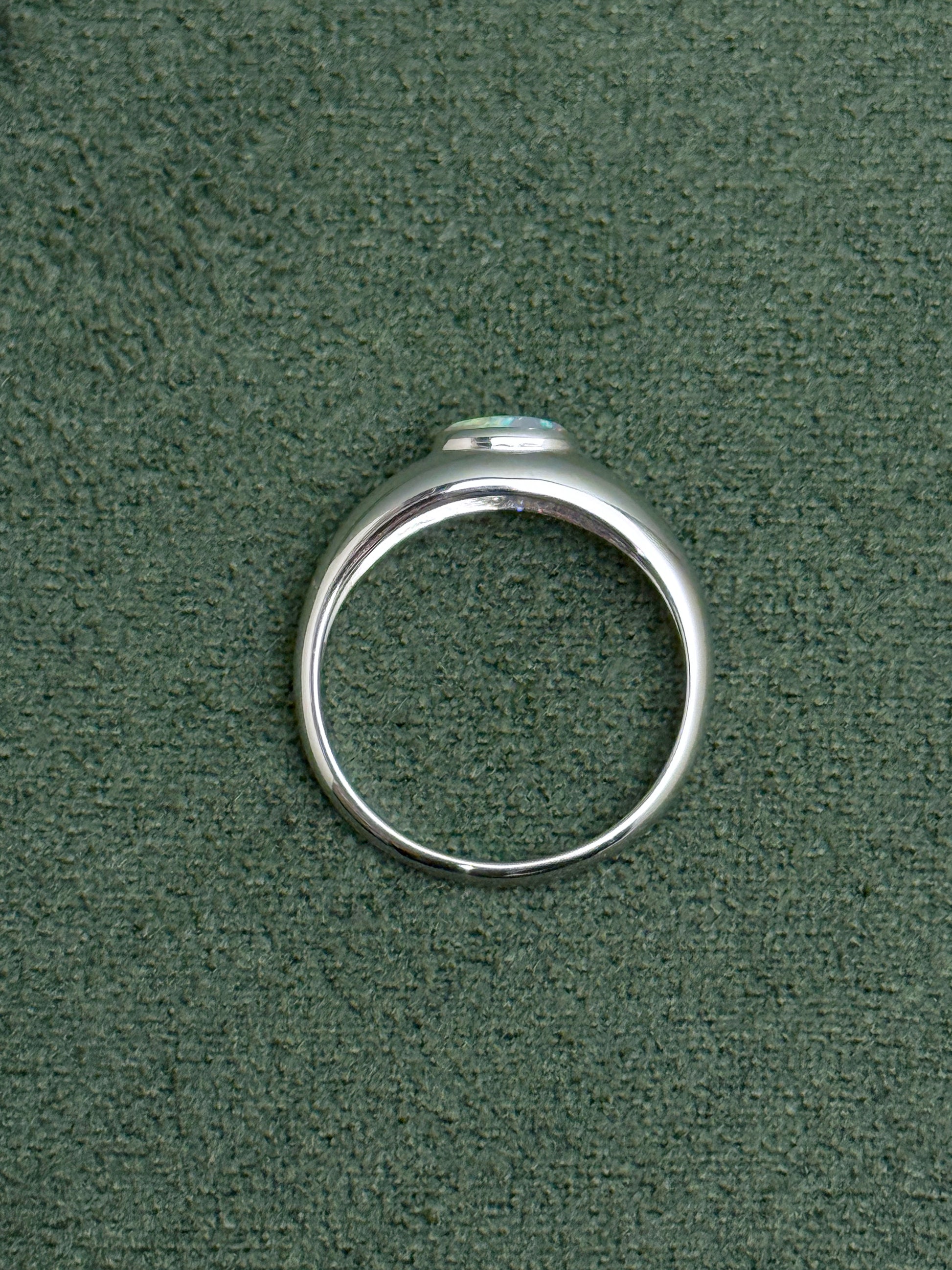 This piece features a stunning Australian solid white opal with blue fires. The ring has a gentle curve and domed profile, perfect for stacking.