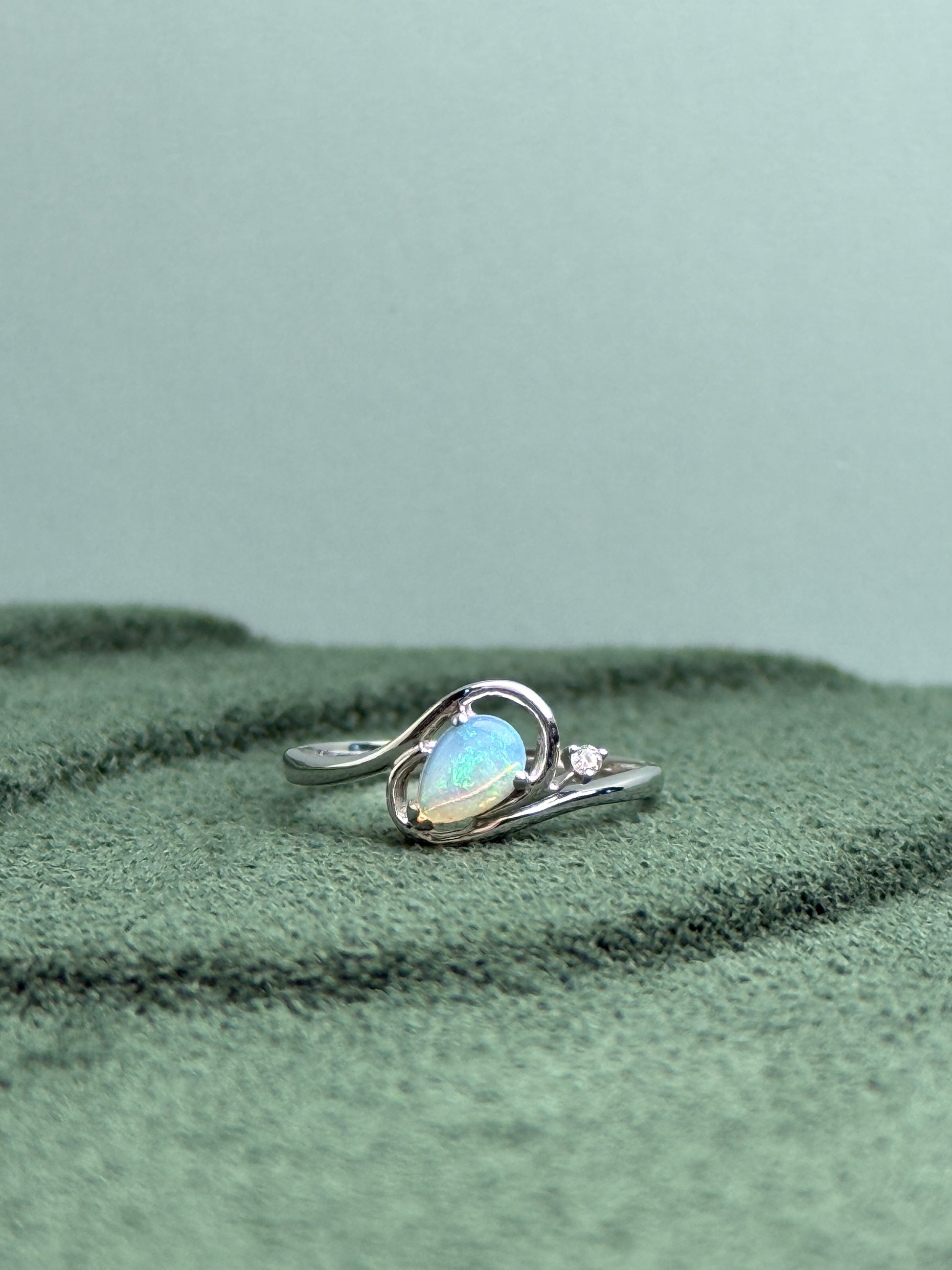This gentle pear shaped Australian solid white opal is accented with delicate swirls of white gold and a small natural diamond.