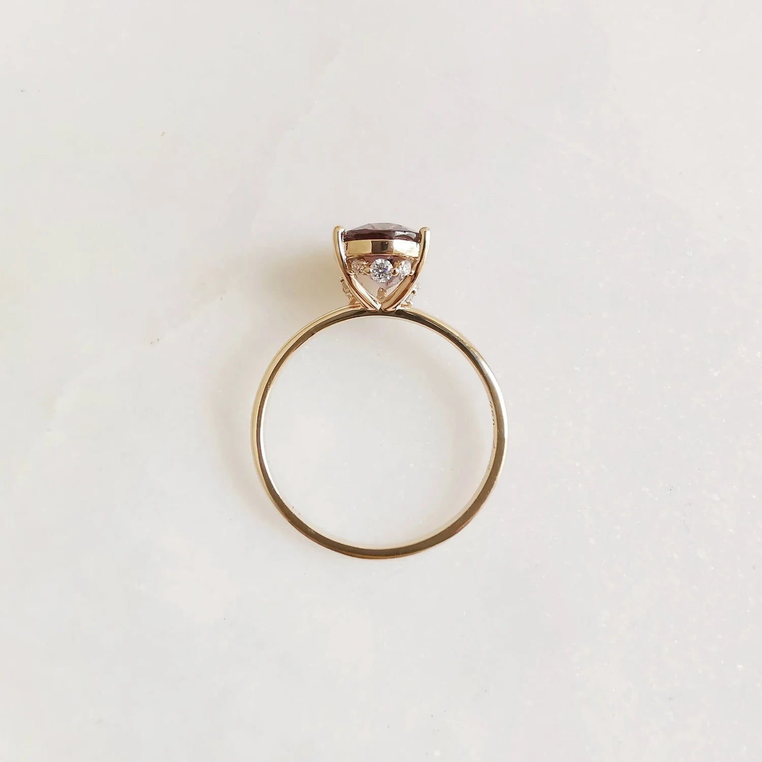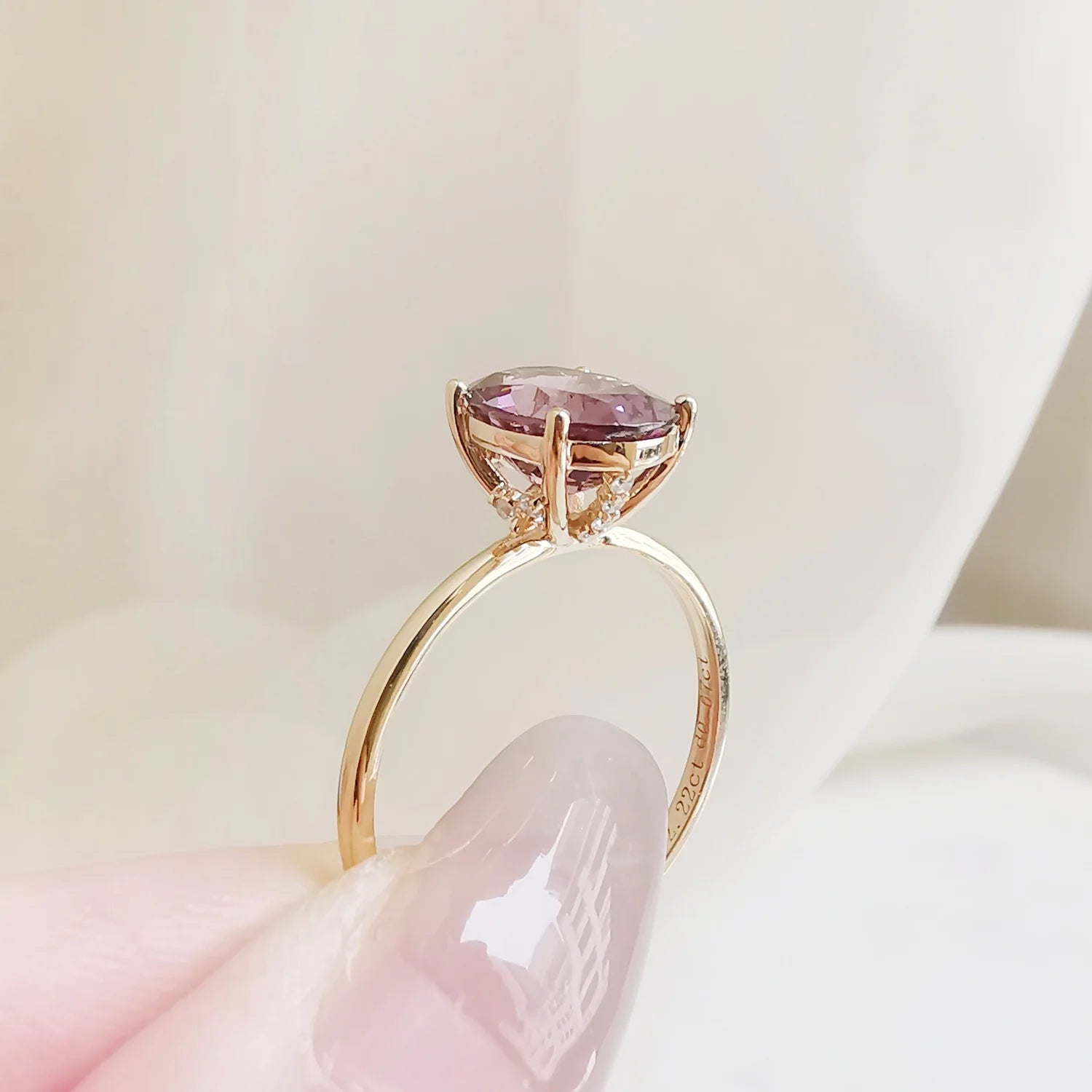 This piece features an eye-catching natural purple spinel in a timeless oval shape as its centre stone, with petite natural diamonds adorning the basket for an additional subtle luxury.